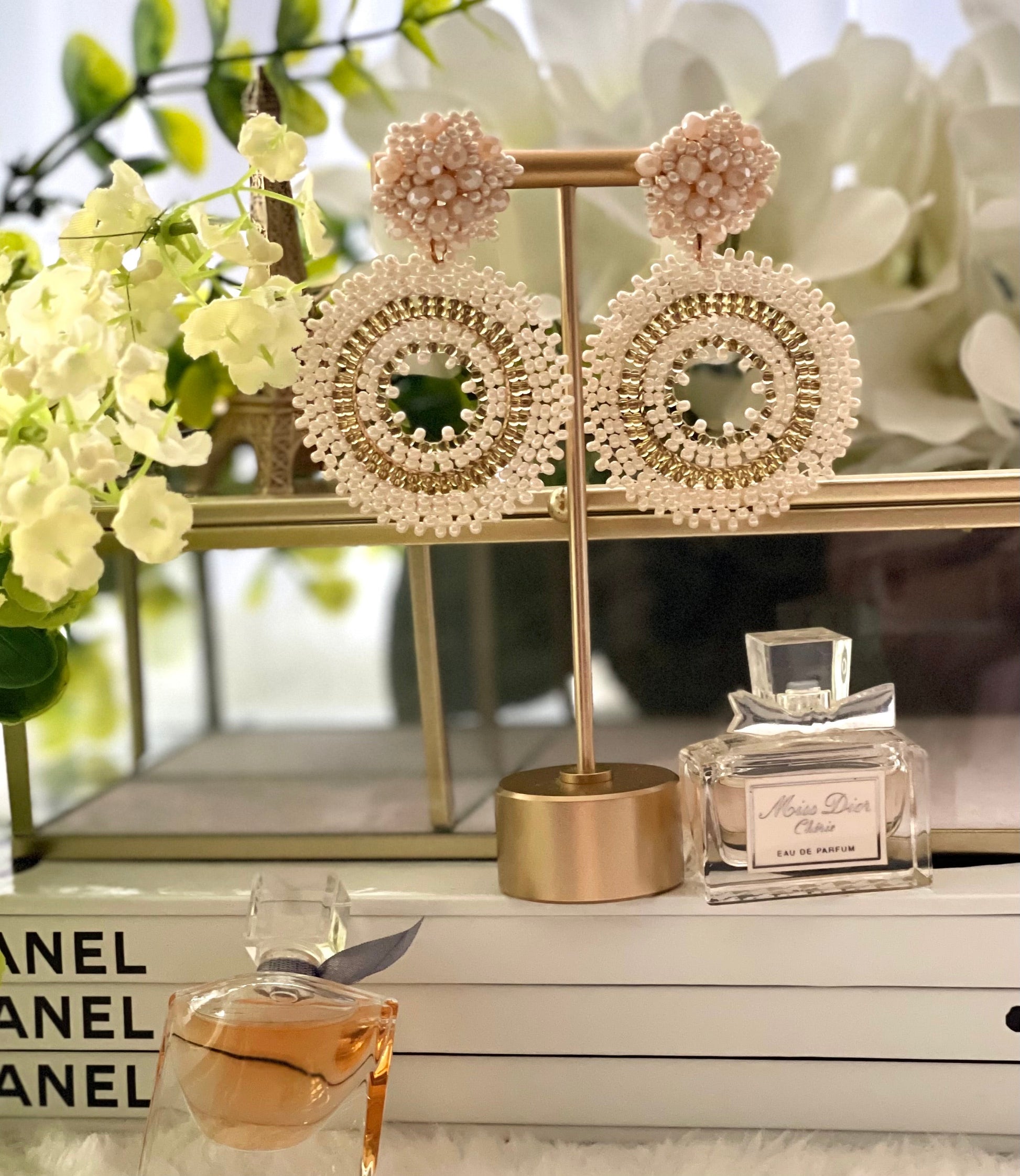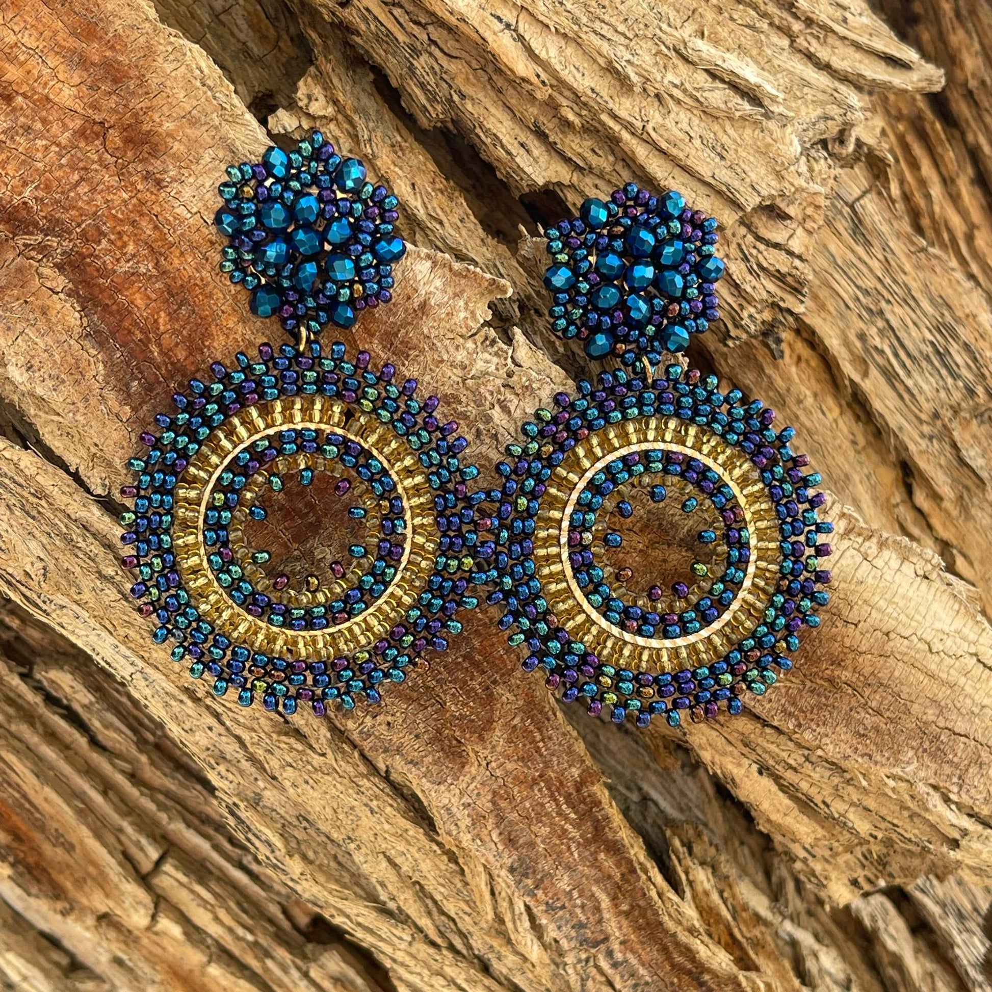 Large beaded earrings with woven clasp, measuring 2.9 inches