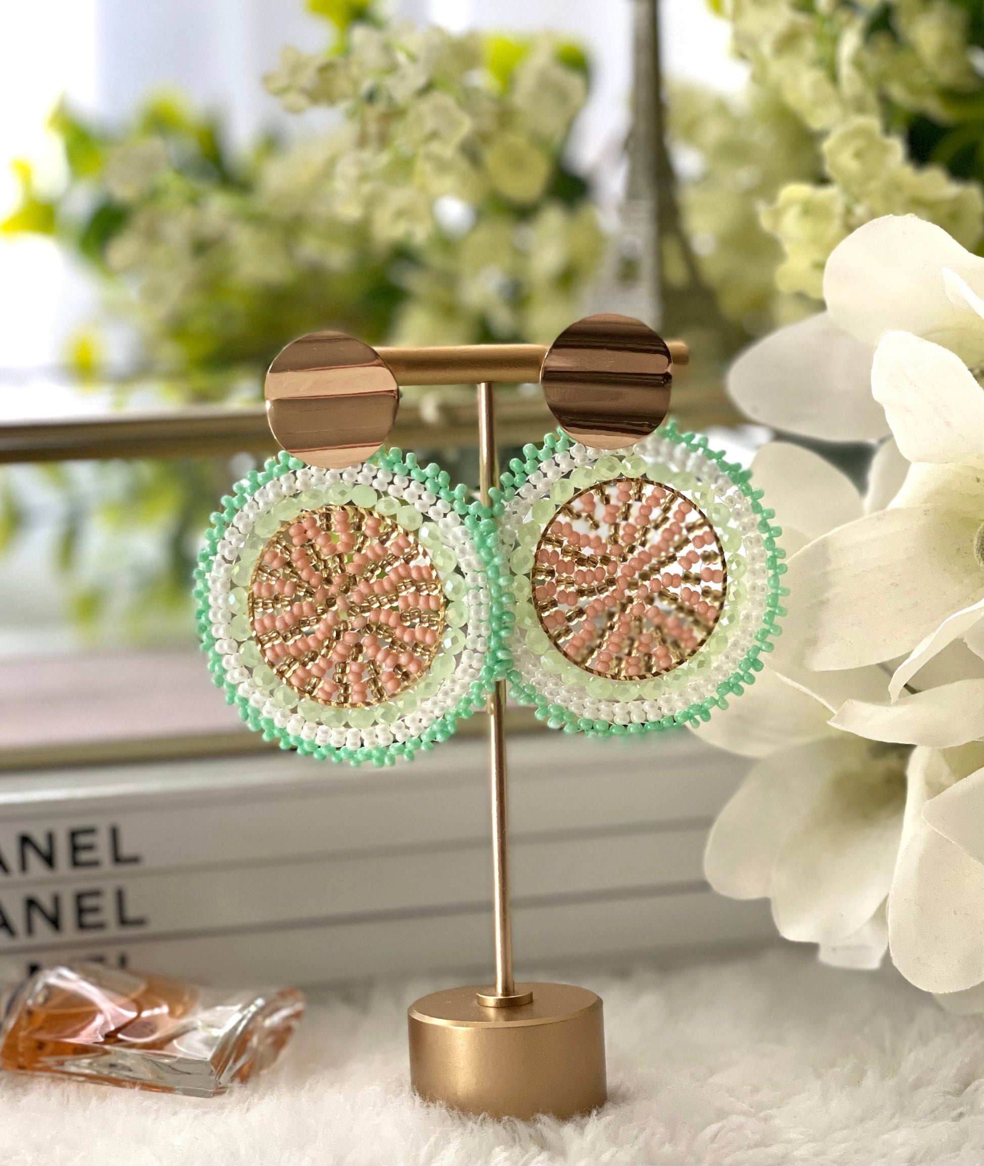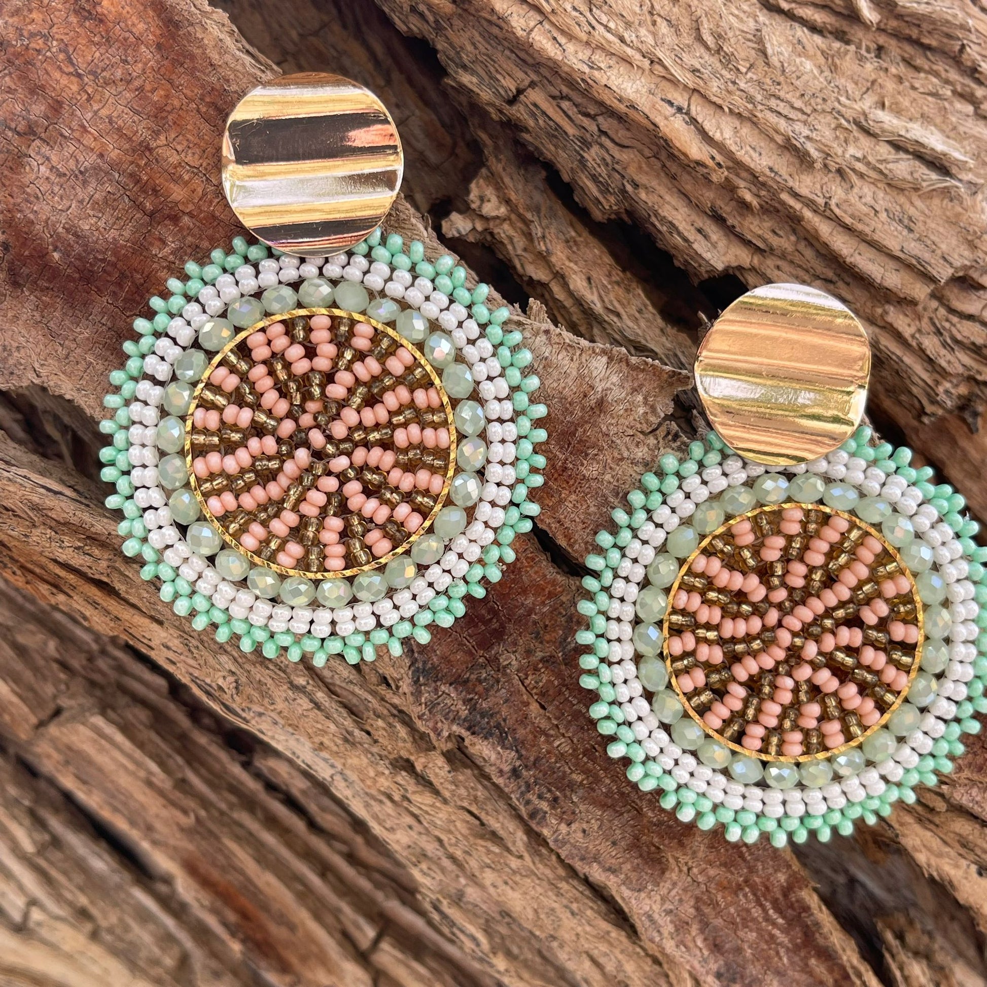 Woven round earrings, with golden clasp.