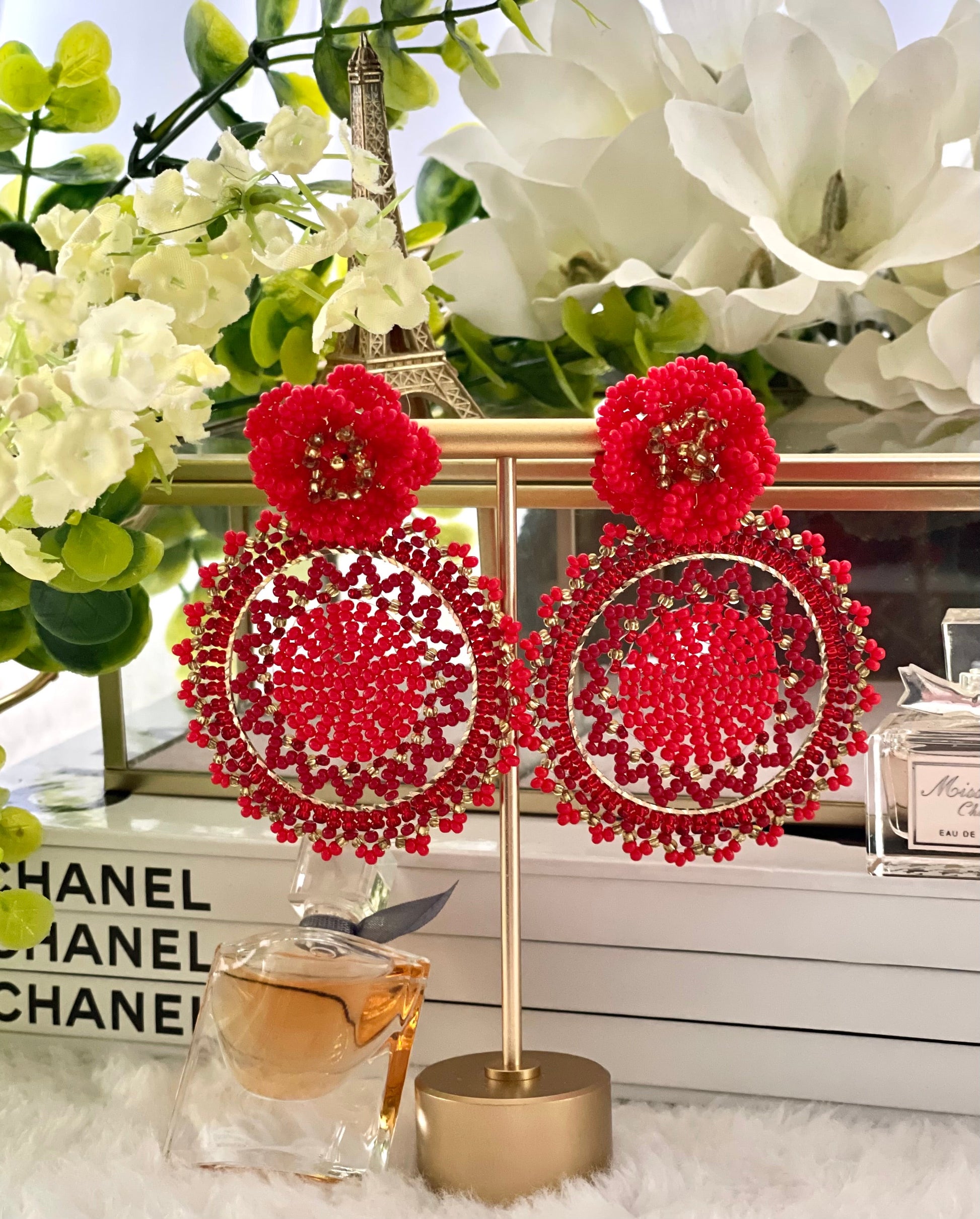 Large beaded earrings with woven clasp, measuring 2.9 inches