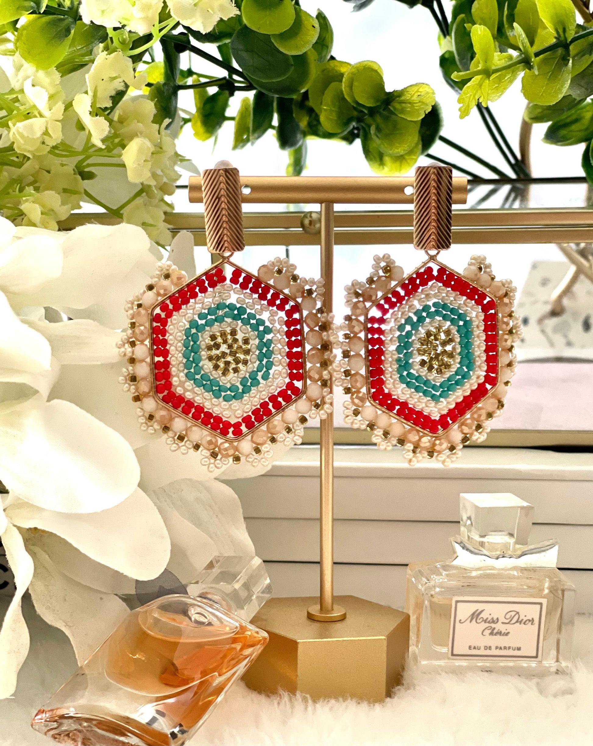 Woven diamond-shaped earrings. With golden clasp. 2.56 inches